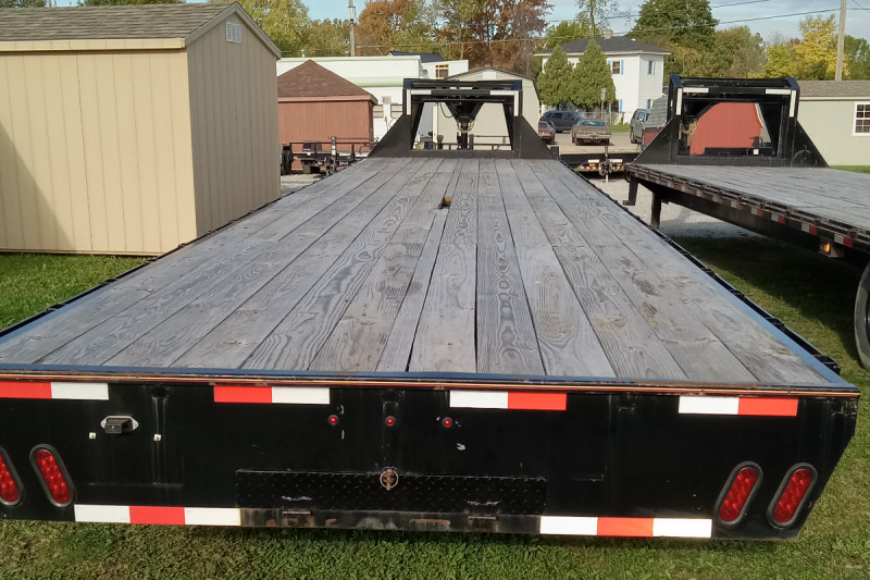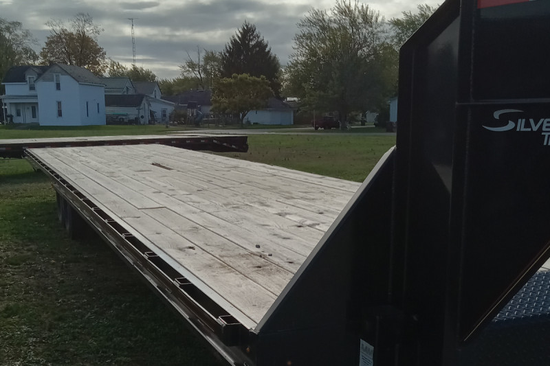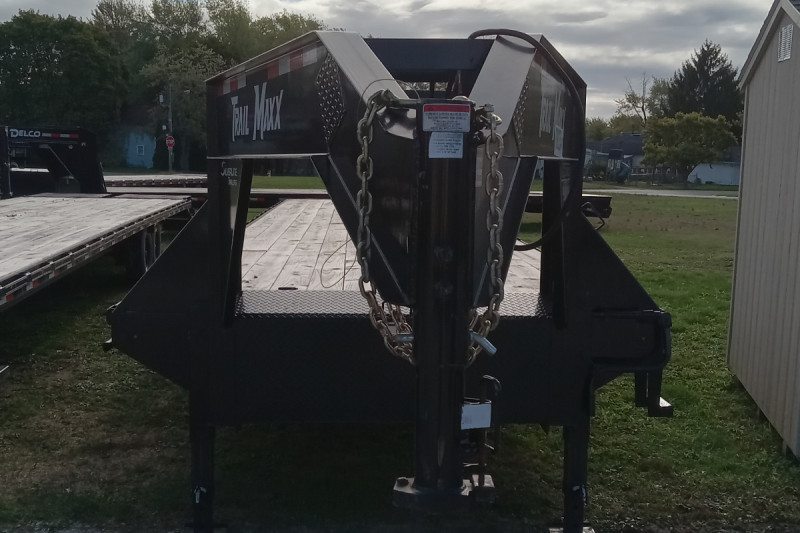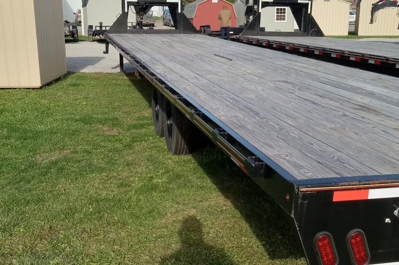 A 2023 Trail Maxx SD27-40 is a 40-foot gooseneck flatbed trailer with a 14,000 lb Gross Vehicle Weight Rating (GVWR), features electric brakes and spring suspension, and can have a 96 to 102-inch wide wood-floored deck. Tires typically include 265/80R16 or 235/80R16, and a standard feature is a toolbox built into the gooseneck.
