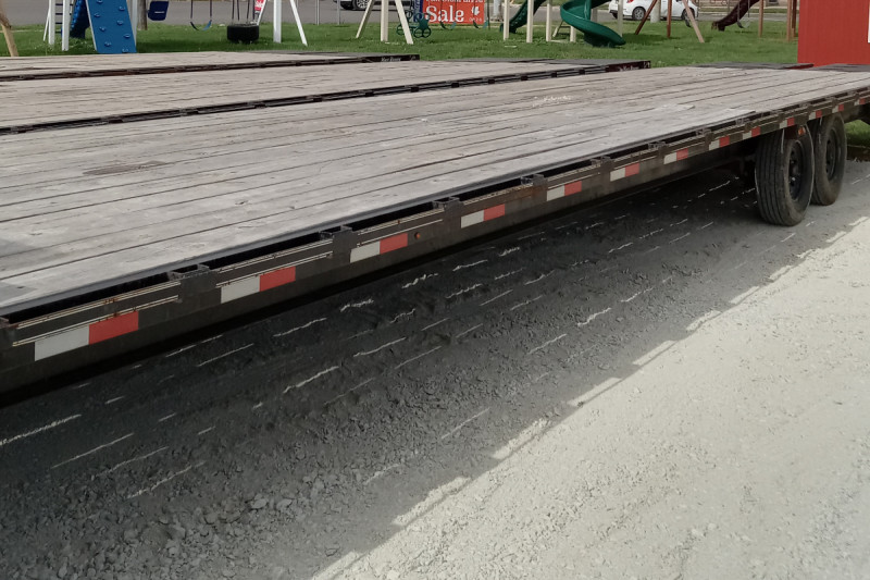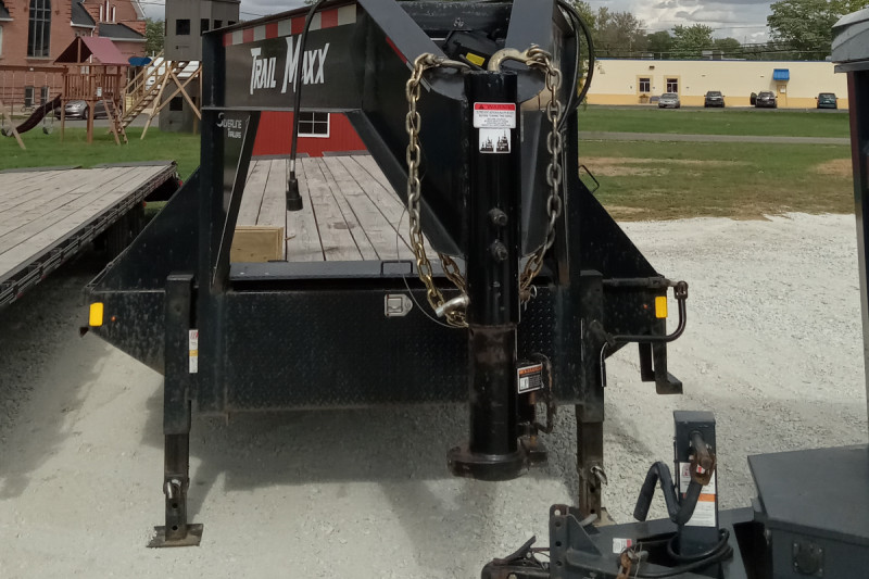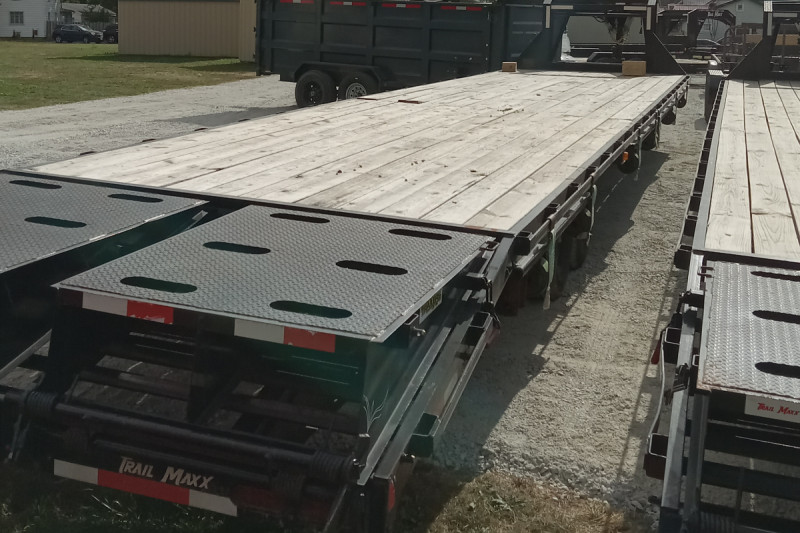 The TrailMaxx MAX27-40 is a 40-foot tandem axle (T/A) gooseneck equipment trailer with a typical 12,000 lb GVWR, featuring a ~35-foot main deck, a 5-foot fixed dovetail, and manual or spring-assisted ramps. It includes an I-beam frame, wood flooring, and electric brakes, but specific features like usable deck width and tire size can vary slightly by model year.